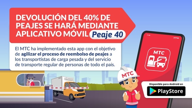 A partir del 10 de octubre, los transportistas de carga pesada y del servicio de transporte de personas de todo el país pueden solicitar la devolución del 40% del pago de los peajes a través de un aplicativo móvil llamado “Peaje 40”, que ha sido implementado por el Ministerio de Transportes y Comunicaciones (MTC).