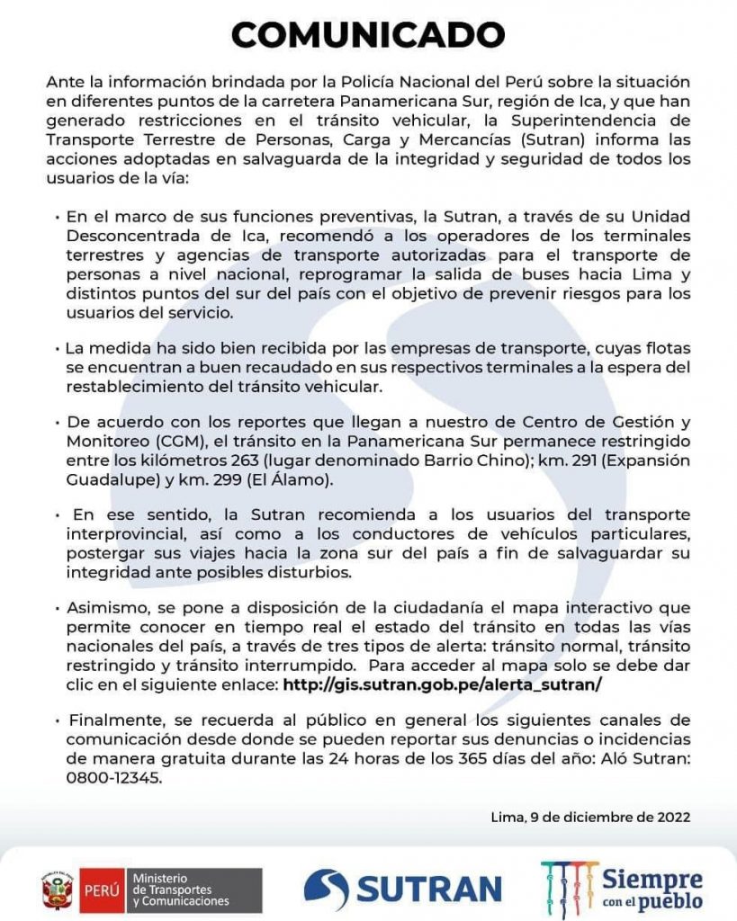 Ante la información brindada por la Policía Nacional del Perú sobre la situación en diferentes puntos de la carretera Panamericana Sur, región de Ica, y que han generado restricciones en el tránsito vehicular, la Superintendencia de Transporte Terrestre de Personas, Carga y Mercancías (Sutran) informa las acciones adoptadas en salvaguarda de la integridad y seguridad de todos los usuarios de la vía: