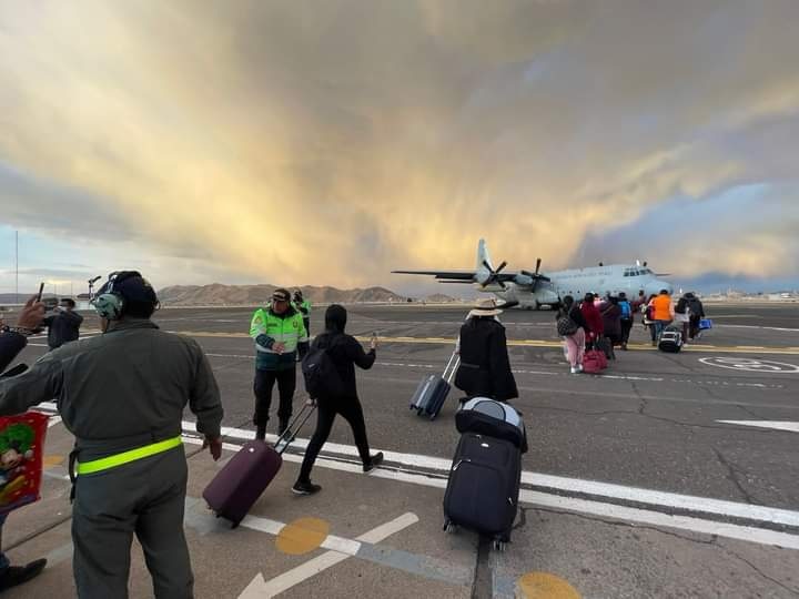 El avión Hércules partió del Grupo 8, en la región Callao, a las 16:00 horas con destino a Juliaca, donde arribó a las 17:50 horas para recoger a los pasajeros más vulnerables que se encontraban varados.