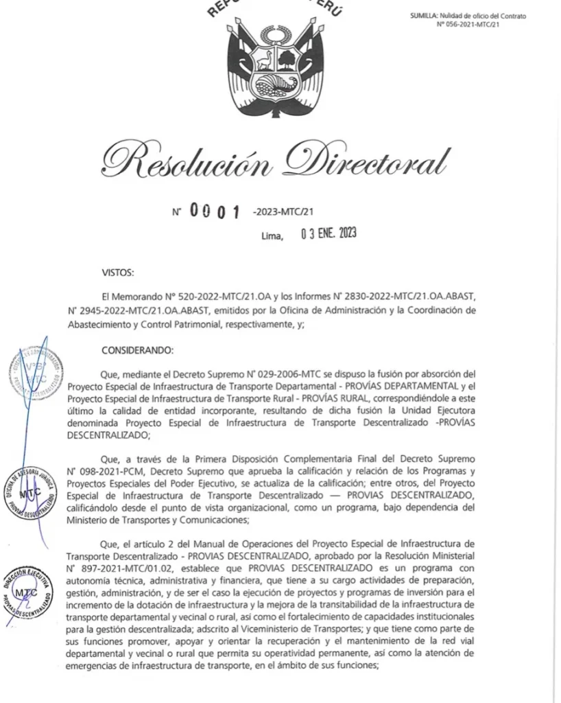 Se trata del procedimiento de selección correspondiente Contrato N° 056-2021-MTC/21 suscrito entre Provias Descentralizado y el Consorcio Supervisor Tarata por un monto de S/.14.451 millones.