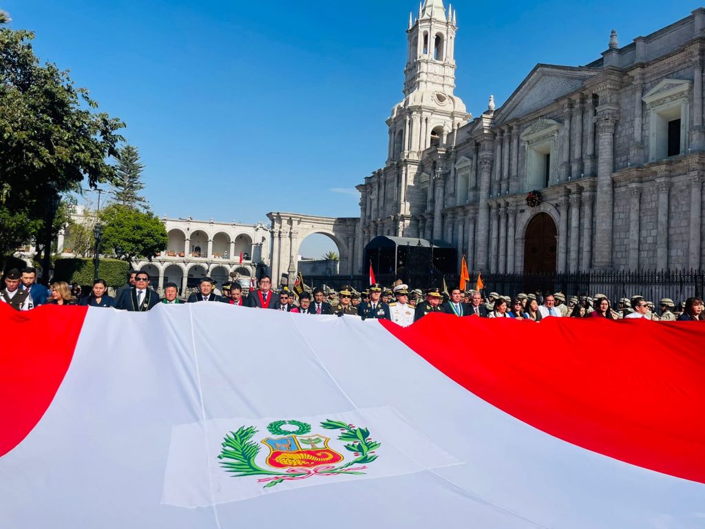 Durante el acto, el señor Gobernador de Arequipa, tuvo el honor de izar el Pabellón Nacional y estuvo a cargo del discurso de orden en el que se resaltó el espíritu patriótico de la población arequipeña y habló sobre la paz, como herramienta preponderante para alcanzar el éxito de las actividades productivas y desarrollo de los pueblos.