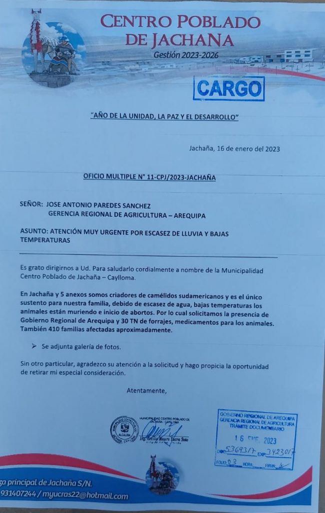 El alcalde del consejo menor de Jachaña, Mauro Yucra Soto llego al gobierno Regional de Arequipa solicitando apoyo para sus comuneros «No solo es el frío sino la escasez de agua las tierras están secas ya no hay pastos naturales, no tenemos presupuesto» dijo el alcalde asimismo la autoridad curso oficio al congresista de la republica Edwin Martinez para consolidar apoyos del AGRORURAL mediante el programa Nacional AGRORURAL» son 30 mil alpacas en riesgo que estan enfermas de los cuales 12 mil están estado de preñes, solicitamos al gobierno Regional y agrorural 30 TN de forraje» manifestó la autoridad de Jachaña.