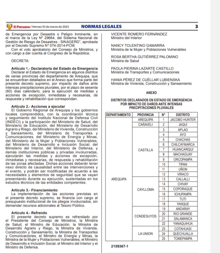 La norma legal publicada el día de hoy, declara en Emergencia al Distrito Jacobo Hunter de la Provincia de Arequipa; Distrito Jaqui de la Provincia de Caraveli; Distritos de Aplao, Ayo, Hachas, Chilcaymarca, Huancarqui, Orcopampa, Tipan, Uñon y Viraco de la Provincia de Castilla; Distritos de Callalli, Chivay, Coporaque, Ichupampa, Tuti y Yanque de la Provincia de Caylloma; Distritos Andaray, Río Grande, Salamanca y Yanaquigua de la Provincia de Condesuyos; Distritos de Cotahuasi, Quechualla y Tomepampa de la Provincia de la Unión.