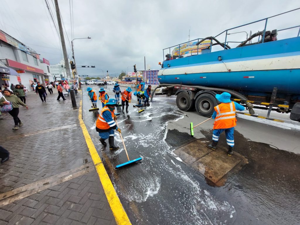 Luego de retirar los residuos, dos cisternas de la municipalidad procedieron a desinfectar las veredas y calles de la plataforma utilizando más de 11 mil 600 galones de líquido desinfectante. Mientras que las trabajadoras de limpieza, utilizando escobillones para restregar las vías.