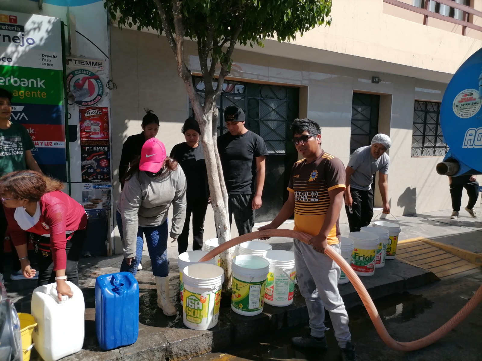 La Superintendencia Nacional de Servicios de Saneamiento (Sunass) verifica la distribución provisional de agua potable, en el distrito de Tiabaya a cargo de la empresa Sedapar, mediante camiones cisterna, para más de 2 mil familias afectadas por la emergencia en el manantial de Tingo.